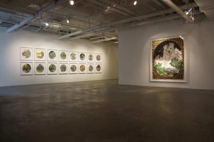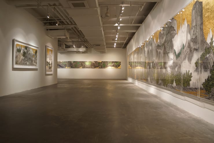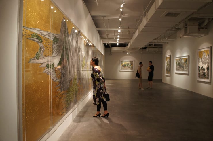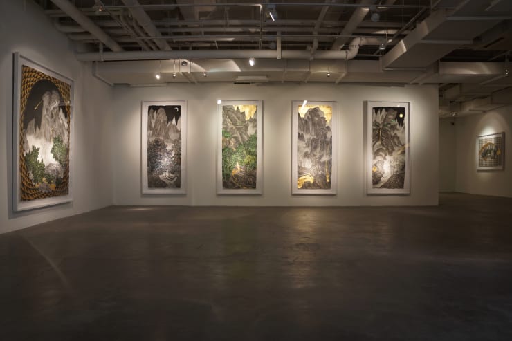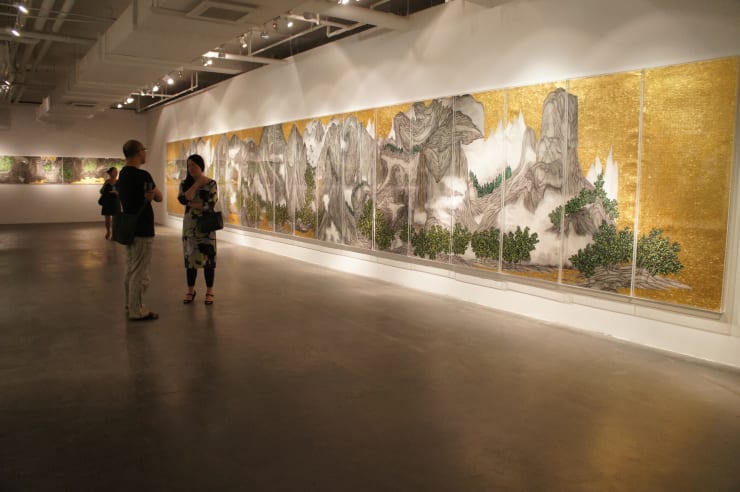Though he owes much in composition to Chinese ink paintings, Yao’s making of his shan shui differs greatly. He uses a fine-point pen, rendering each line distinct, rather than a calligraphy brush, with its soft strokes. The ink lines are layered on to the paper’s rough surface, with shades of varying intensity, to simulate the effect of flatness through an array of busy and comparably turbulent lines. In this way, the “pseudo landscapes” formulated through intensive labor, evoke the tragic solemnity exemplified in Chinese literature: “the silkworm only stops weaving upon its death.” Gold leaf fills the empty spaces of the composition, possessing a charm typical of Buddhist wall paintings. The trees, covered in glitter similar to children drawings, add in the finishing touches. Yao deliberately avoided traditional materials and methods such as inscriptions, seals, rice paper, moss dotting, traditional binding, brush strokes, and ink wash, in the creation of this series. The result is a mixed style, which appears to be recognizable within traditional aesthetic parameters, but cannot be truly identified. The style can be seen as an implicit rebellion against grand conventions.