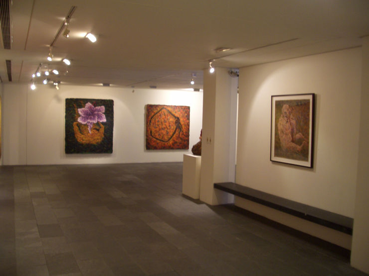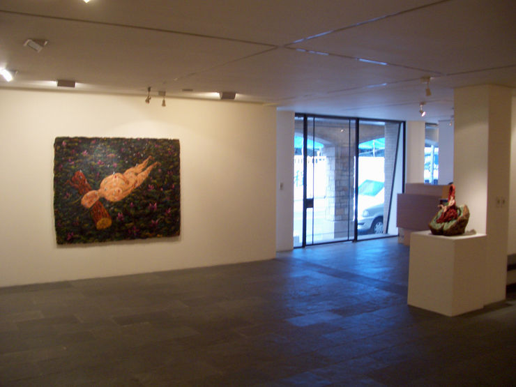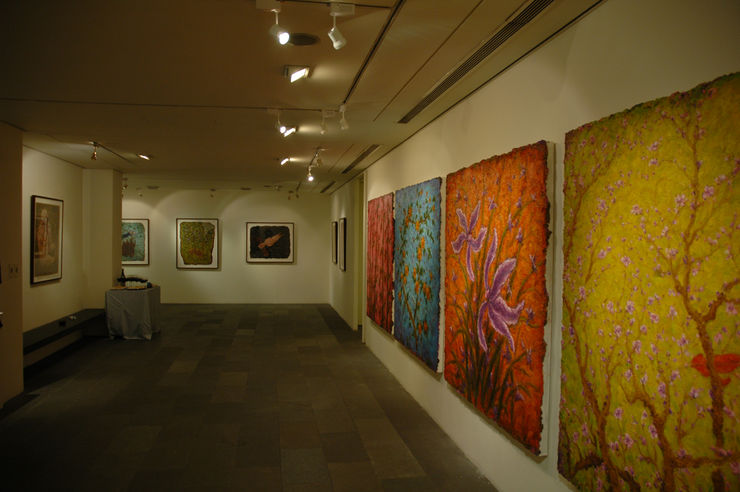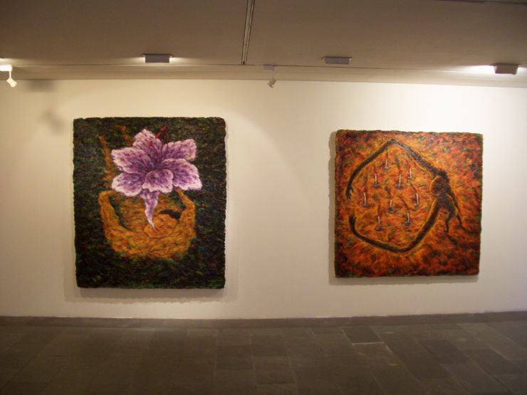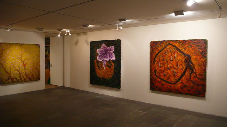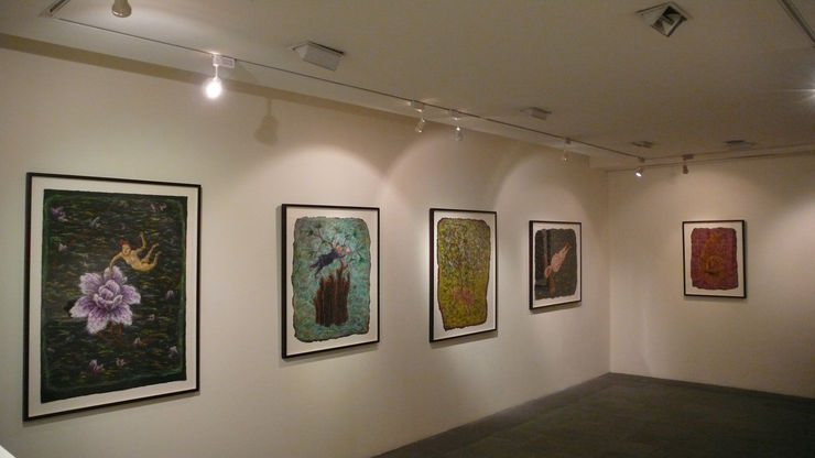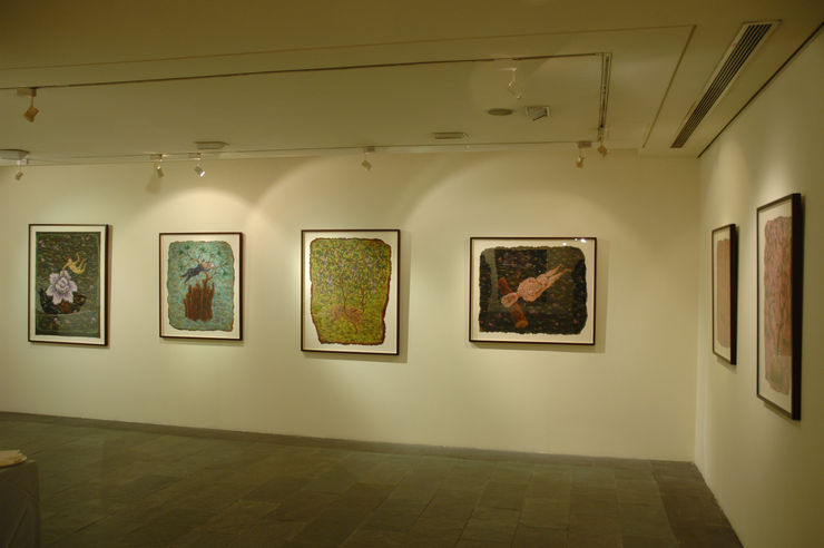 對我而言,在形式閱讀上,可以依賴這些現有的文字,順利進入黃榮禧的世界。但是除了形式及風格之外,認識一位畫家,或說是一個畫家的創作,還有什麼方法呢?我看黃榮禧的畫時,明明就有一種來自純身體性的不安,或說是對深層意識的騷動,絕非風格可以解釋,也無法用多義、戲謔、曖昧等形容詞來概括,於是我除了以上從形式分析下手的閱讀法外,也嚐試靜下心來凝視這些作品,讓自己接近圖象,鑽進那些顏料中,慢慢的,我可以察覺到自己對這些作品的反應,也慢慢能領略黃榮禧像狐狼般摸索靈魂黝黯底線的企圖及行徑。在黃榮禧的畫面,直覺上感到這是一個滿佈瘀青暗影的世界,他的主角在其中匍匐前進,危險隨時如狂風勁雨,疾掃而來,他孤行其中,深陷於空虛、疏離、悲哀、背叛、恐懼、愛戀情仇的泥濘裡,又因泥淖與自己溶為一體,看不清煩惱憂鬱的來源是那泥淖抑或是自己,超越之路亦滿佈荊棘。這一張一張沒有出路的畫面,主角要不是被泥淖糾結,就是沈溺在泥淖中,三千煩惱絲被纏繞綁結在樹枝或大地上,完全沒有出汙泥而不染的氣節,相反的,是一種暗示心靈永遠「擁有自動製造疾病、憂鬱、反常、折磨的能力」。他運用反覆重疊的顏料色塊,更增添了畫面不透明感,一切都沒有光,沒有影,所有的人、物、山、水、花、草、鳥、獸都在沒有時間、沒有光源、不分輕重的世界裡。連「夏眠」這種輕鬆的主題及姿態也被這種個人化的塗法形成一個沉溺在陰森池塘中的畫面,充滿了危險,不確定性,不知該讓靈魂在此放鬆,抑或等待下一分鐘的危機。就連靜物花草為主題的畫,例如「梅」、「蘭」、「竹」、「菊」,也在同樣的畫法下顯得花魂昭昭然,尺寸、比例的粗糙處理及刻意變形法使的靜物不再「靜」,它們像是仍在成長、增殖、變形、扭轉的魂魄,咄咄逼人。