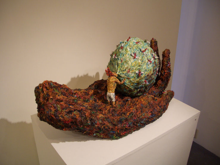 靈魂,其實依照亞里斯多德的古典定義,是「生命之源」,歷來一直常有豐富的引申意義:如火與溫暖,繁殖與靈感,神迷與幻境,愛與瘋狂⋯⋯。靈魂像是一片幅員遼闊的內在風景,邊際毗連了許多領域,如夢、想像、詩歌、宗教、神話、死亡、陰間等等,像是我們個體的視差點( Parallax point )是我們與世界文化之處[3]。黃榮禧的畫在這些範疇中尋找靈感,是落在理性之外的言詮方式之一。此外,他的刻意營造出來的「畫面雕塑化」、「雕塑畫面化」,也讓他的作品進入超現實之境,失去地平線後的場景,像是引導觀眾進入潛在深層意識,令我想起榮格自傳中,對自己第一次喝醉酒的描述:「我發現這些小杯子讓我飄飄欲仙,進入一個全新、出乎意料的意識狀態。再也沒有什麼內在和外在、「我」和「他者」,一號人格和二號人格不見了,謹慎和膽怯無影無蹤,天和地、宇宙和在其中爬行、飛翔、轉動、上升或落下的一切,全都變成一體了。我既感丟臉又快樂無比地喝醉,彷彿沉入一片極樂的冥想汪洋裡,因為波浪猛烈起伏,我讓眼睛、雙手和兩腳緊貼著固定的物體以保持平衡,覺得街道在起伏,房屋和樹木在搖擺。」[4]我不得不佩服黃榮禧這種「暴露自我」的勇氣,藉著作品黃榮禧面對靈魂中的慾望、恐懼、焦躁、不安。自我承認「這個殘酷的世界,就像等在一邊埋伏,在一個人一走出教堂之後,就隨時對他展開攻擊」,力道強勁,摧枯拉朽,但是在最後他所完成的聲明,不是忿怒,也不是惆悵,相反的是一種到底靈魂有沒有被魔鬼收買的疑惑,或說是酸楚。那些人物都患有大頭小身體症,想的很多,卻無力(無膽)實踐,一切都只存在於意識的交戰。