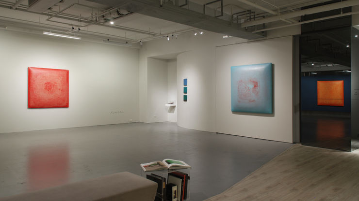 而相較於一貫的溫潤、沉穩質地,蘇笑柏2020年的新作系列,自視覺上的明亮用色與薄透的流動光感,便予人一種沁人的清新氣息;作品胚體轉而成為輕薄的塑形,令彷彿懸浮於牆面的輕盈量體,與空間對話出多層次的空間閱讀;而一層層漆料經過「覆蓋」、「油洗」所堆疊出的迷人肌理,在在應和著蘇笑柏對於全球疫情壟罩下沉重氛圍的反動──在藝術所體現出的不同維度中,所創造那游弋自如的繪畫風景。