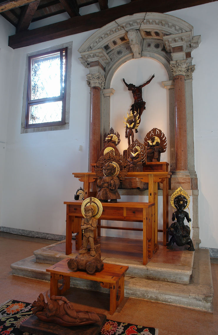 楊茂林這次在威尼斯聖喬凡尼和保羅大教堂的聖托馬索堂( Sala S. Tomaso )舉辦的個展「婆娑之廟–台灣製造」,無疑是一場跨越古今、橫亙東西、穿越宗教語文化的一場藝術對話。